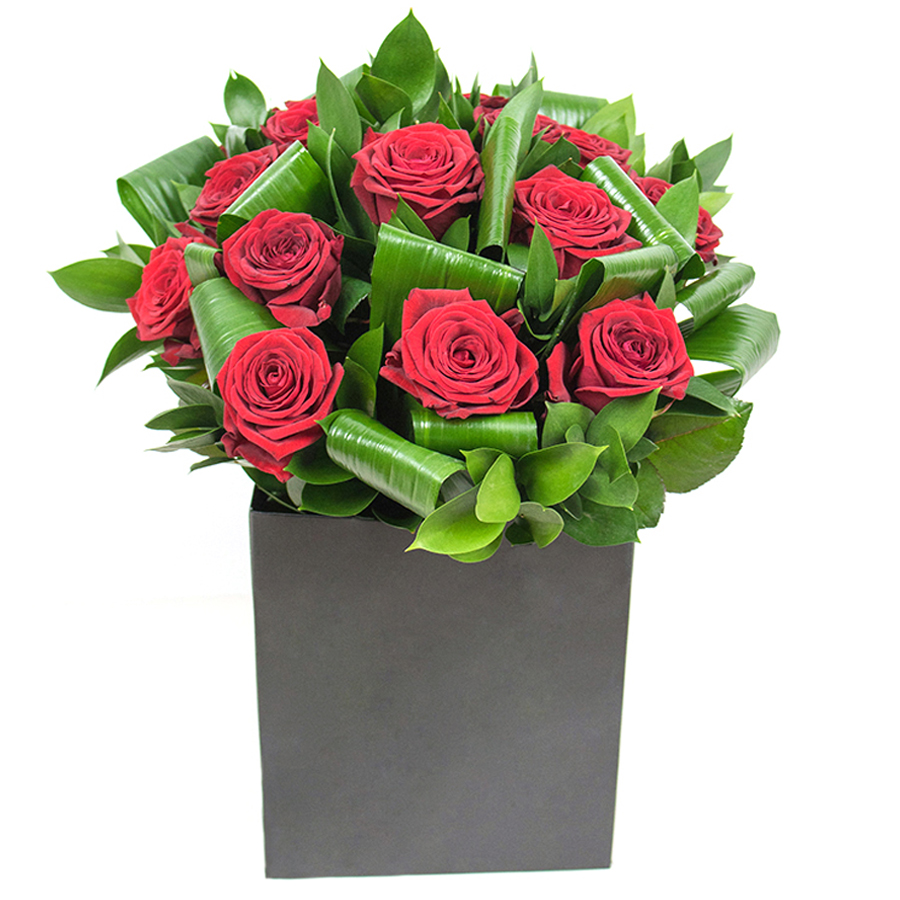 Add a touch of elegance with our sophisticated red rose ensemble, featuring aspidistra leaves and ruscus. This unique bouquet showcases a harmonious blend of colors and textures, perfect for enhancing any home or as a meaningful gift.